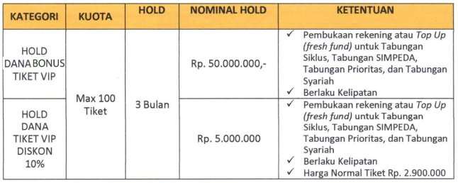 - Apabila Nasabah melakukan pengambilan dana sebelum berakhirnya masa blokir dana, untuk kategori HOLD DANA FREE TIKET VIP, Nasabah akan dikenakan penalti sebesar harga tiket VIP normal, yang disesuaikan dengan lamanya periode blokir dana pada program ini, untuk setiap tiket yang diterima Nasabah.