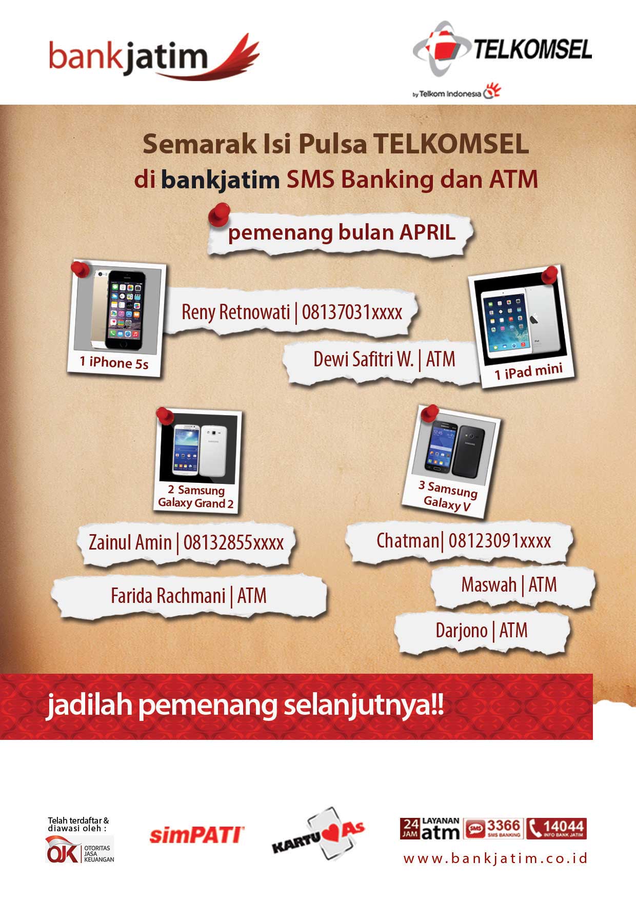 Pemenang Semarak Iisi Pulsa Telkomsel Periode Maret & April 2015, untuk pengambilan hadiah dan konfirmasi dapat menghubungi Kantor cabang pembukaan rekening mulai tgl 12 mei 2015